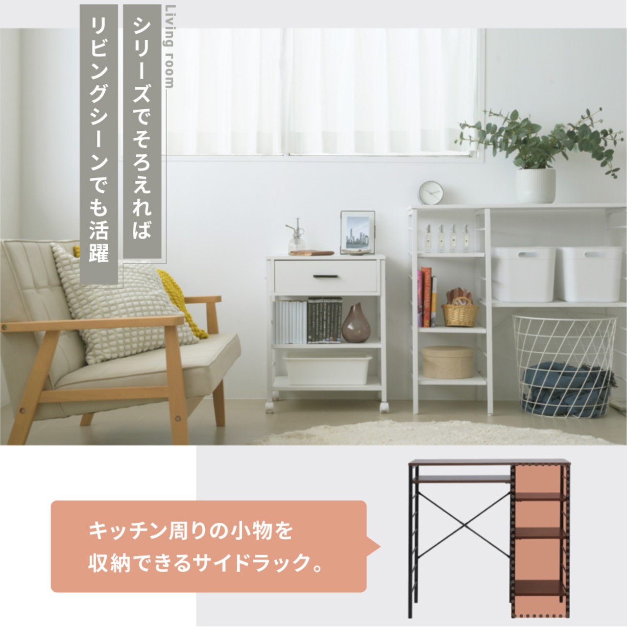 サイドの収納スペースは可動棚なので、収納するものに合わせて高さ調整が可能なラック。