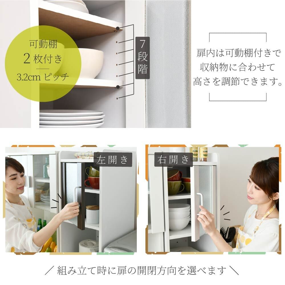 組立時に左右開きが選べ、可動棚2枚で効率よく収納できます。